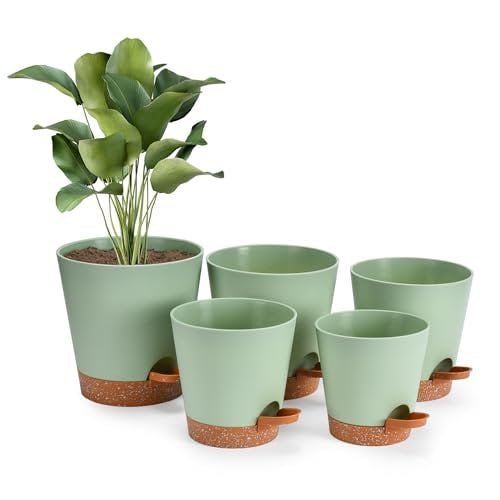 Hallops Self Watering Planter (7/6.5/6/5.5/5 Inch) - 5 Pots with Saucers - Garden Plant Pots with Easy Bottom Holes for Healthy Flowers, Herbs, and House Plants for Indoor with Drainage - Green