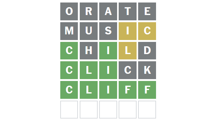 That meant four options were left, and I found myself trying CLICK. It turned 'L' green, but still left those last two characters a mystery.