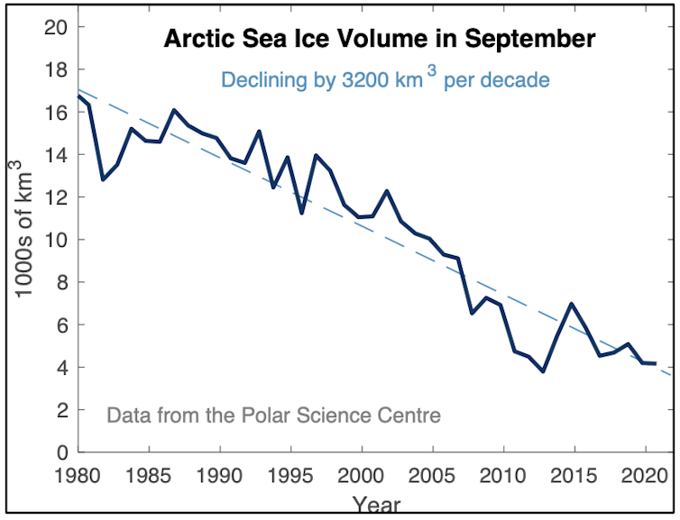 The rapid Arctic temperature increase is matched by the rapid and accelerating loss in minimum (summer) sea-ice volume (Figure 2), which further accelerates the temperature rise in a spiral of reinforcing feedback loops.