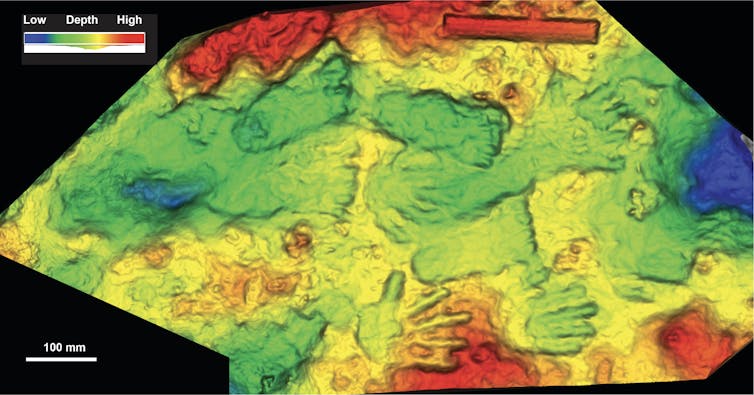A 3D-relief model of the Quesang fossil hand and footprints with colours showing the depth of the prints within the rocks.