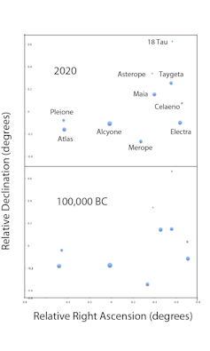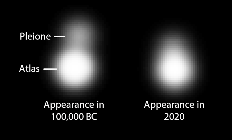 But if we take what we know about the movement of the stars and rewind 100,000 years, Pleione was further from Atlas and would have been easily visible to the naked eye. So 100,000 years ago, most people really would have seen seven stars in the cluster.