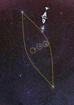 Close to the Seven Sisters in the sky is the constellation of Orion, which is often called “the saucepan” in Australia. In Greek mythology Orion is a hunter. This constellation is also often a hunter in Aboriginal cultures, or a group of lusty young men. The writer and anthropologist Daisy Bates reported people in central Australia regarded Orion as a “hunter of women”, and specifically of the women in the Pleiades. Many Aboriginal stories say the boys, or man, in Orion are chasing the seven sisters – and one of the sisters has died, or is hiding, or is too young, or has been abducted, so again only six are visible.