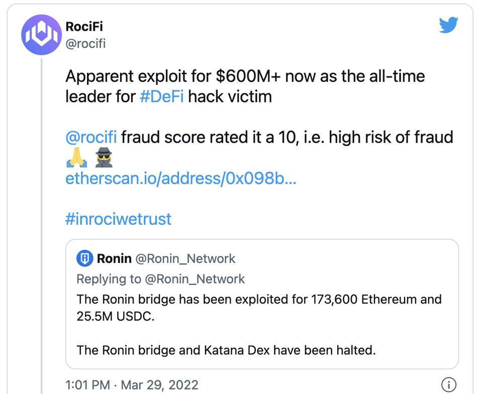 The most frightening thing about the hack is not the size, but rather the timing of realization. The Ronin team spotted the hack 6 days after it initially occurred!