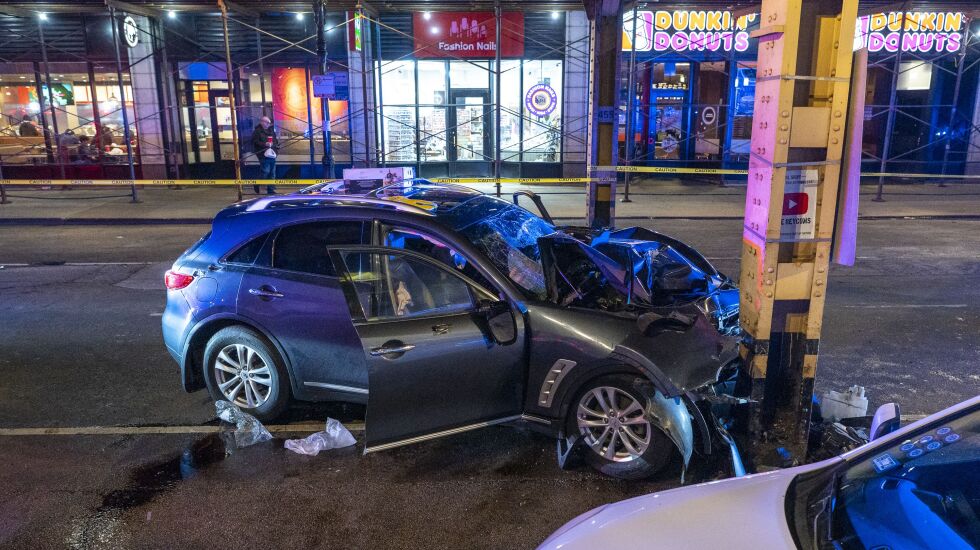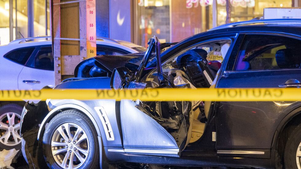 The driver was in her car in the 100 block of East Lake Street when a man and woman got in about 5:40 p.m., police said. There was a struggle and the car hit the support beam.