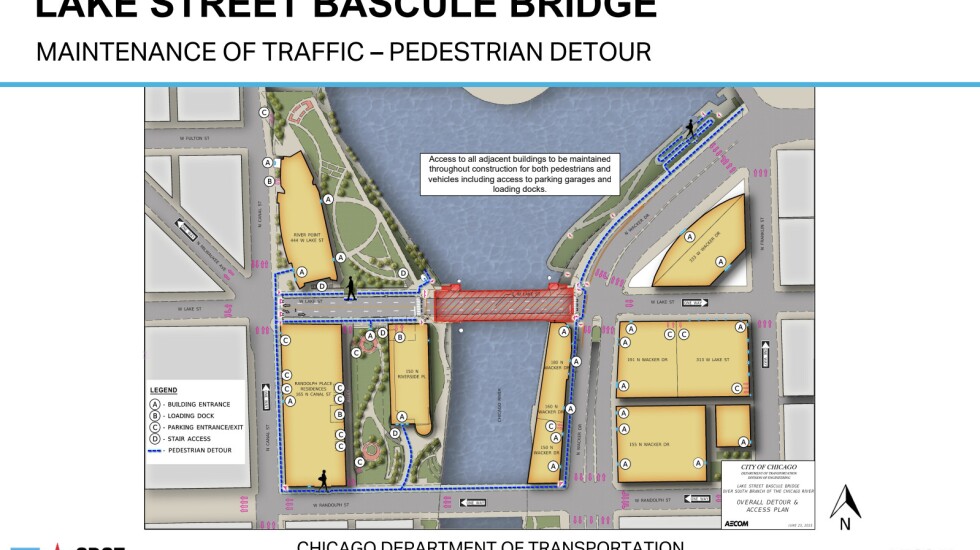 To cross the river, pedestrians will be rerouted along Randolph Street. Cars going east will cross the river on Washington Street and west on Madison Street.