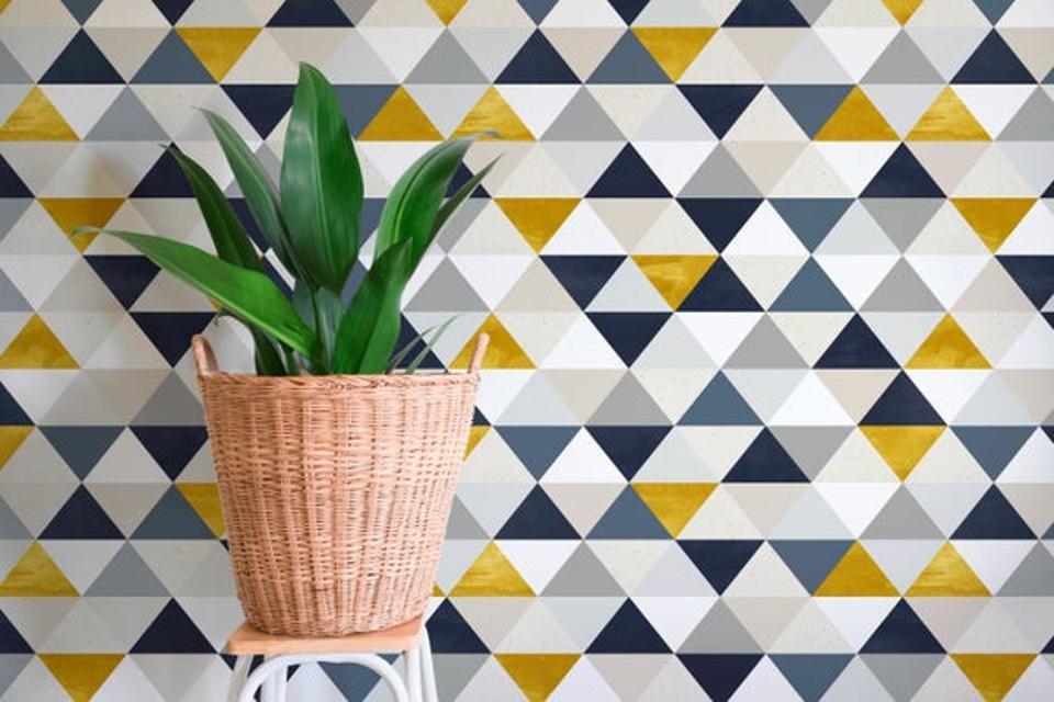 When you want to go big or go home, opt for this this standout print from Etsy’s Ondecorstore. Featuring stacked triangles in shades of navy, gold, tan, white and grey, this geometric paper is a total statement piece. Layer it behind a bookshelf to add a cool surprise, or try it behind your headboard for an accent wall. Choose between smooth, canvas and fabric textures for a finish that just feels right.