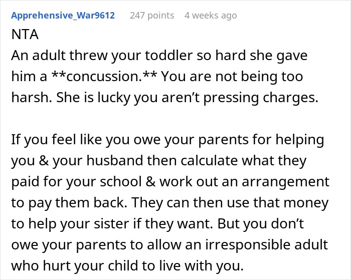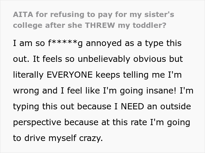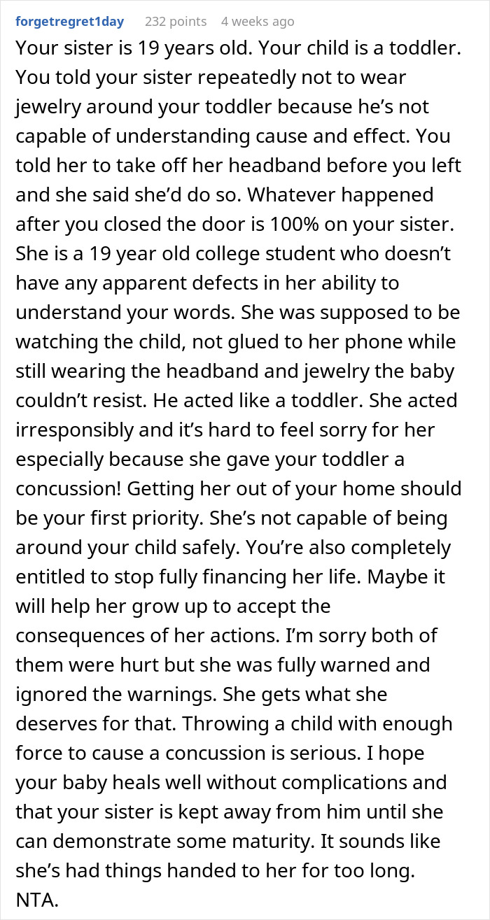 The mother recently asked netizens whether she was overreacting by withdrawing college funds and kicking her sister out after she caused her toddler’s concussion. She sparked a heated debate among commenters: was it just an accident or was the sister being too irresponsible and deserved her punishment?
