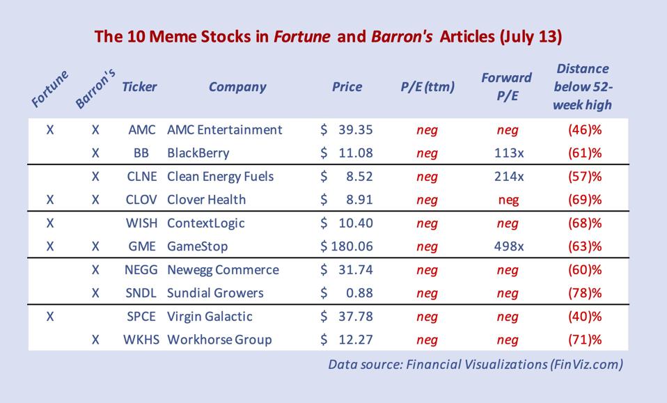 “Fortune published ‘What will be the next big meme stock? Chatter on Reddit’s WallStreetBets offers hints’ on June 28. Barron's just published (July 12), ‘Meme Stock Trade Far From Over,’ and it is an especially important contrarian indicator. The cover title, atop a drawing of rocket ships with meme stock symbols, is ‘Meme Stocks Defy Gravity – The boom in retail day-trading persists as Wall Street struggles to respond.’ Turn to the story and the additional headline gushes: ‘The Market's MEME Generation – A half-year later, a youthful retail day-trading boom is showing signs that it has staying power.’ Except that 6-month description is actually only a few days (or hours) of rocket ignition when the stock charts are examined.”
