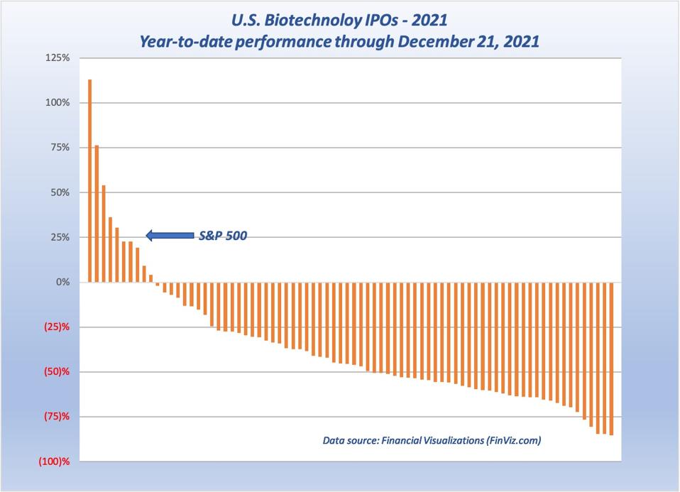 After the early excitement, we now have the facts. The common 2021 result is a big bust. Huge price declines from exciting, but unsupportable highs. (For some biotechs, the excitement high was the offering price.) And now even the few "winners" are ending the year with disappointing downtrends. These two graphs show the dismal picture for all the biotech IPOs this year (some were SPAC deals).