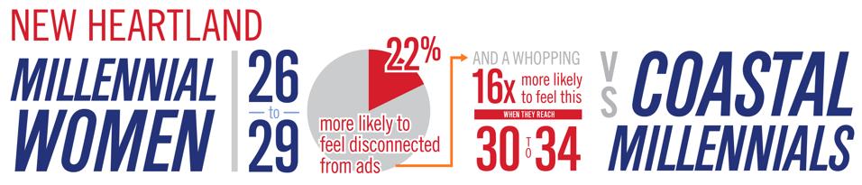 There’s more to the insight that New Heartlanders don’t feel ads understand them. New Heartland women tend to become more disconnected from ads as they get older and as their buying power increases. New Heartland millennial women ages 26-29 are 22 percent more likely to feel disconnected from ads versus Coastal millennials, and they are a whopping 16 times more likely to feel disconnected when they reach ages 30-34. These are just two opportunities within this one, very large segment.