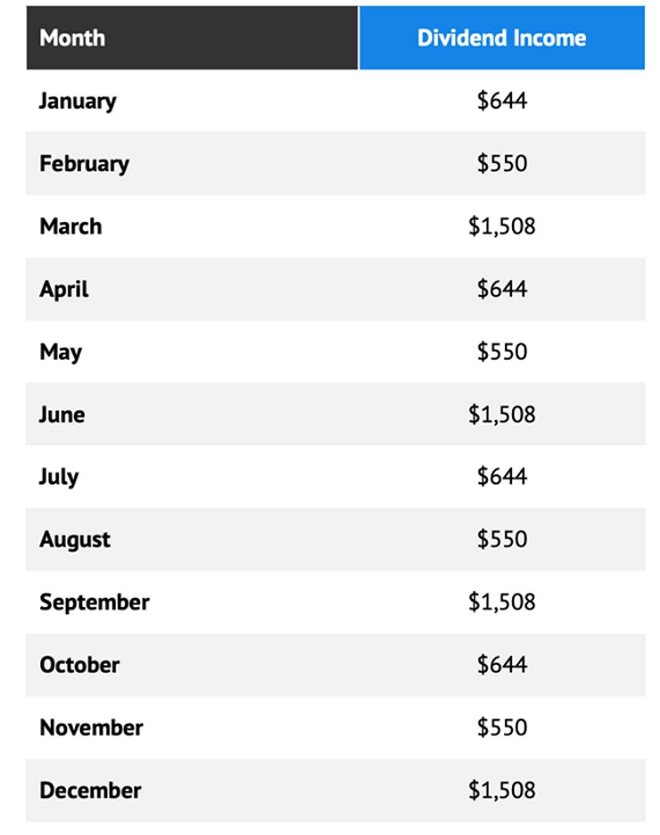 That’s a nightmare! Your monthly income ranges from just $550 a month to $1,508. And you’re still bagging just a 2.2% overall yield! And while switching to other blue-chip stocks could get you a higher yield, it won’t solve the problem of inconsistent income because very few pay monthly.