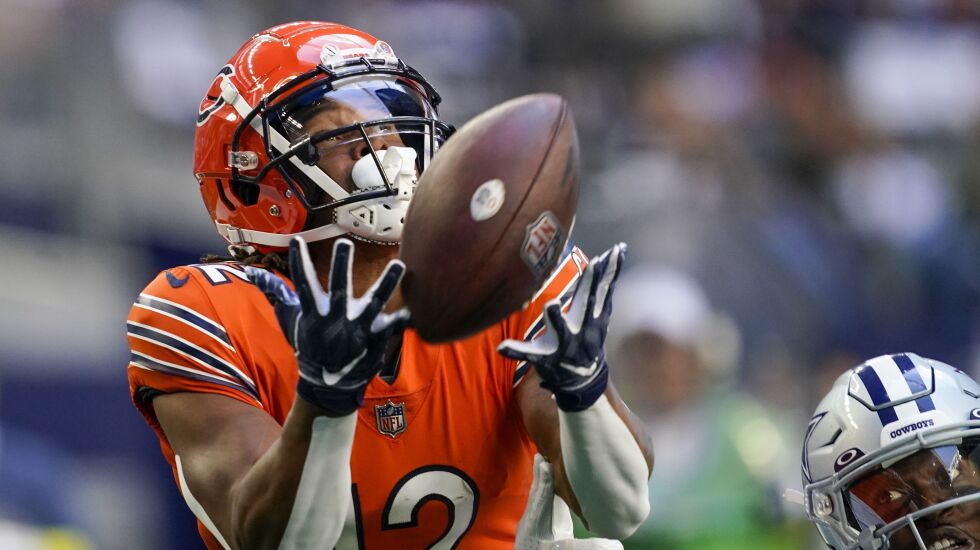 Six Bears caught passes Sunday, led by Darnell Mooney with seven receptions for 43 yards and his first touchdown of the season. It was a 16-yard bull’s eye from Justin Fields in the second quarter, leading Mooney perfectly into the left corner of the end zone over tight coverage by All-Pro Xavien Howard.