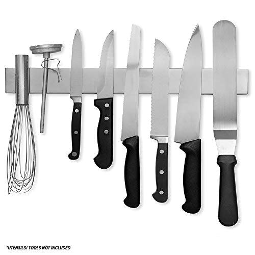 Clear up the clutter in your kitchen with this magnetic knife bar. Strong magnets covered in elegant stainless steel keep your knives and other tools securely in place, and at 16-inches, this magnetic strip is generously sized. This magnetic bar is not limited to your kitchen either, use it in your garage or craft room to keep tools and supplies out of the way but still accessible.