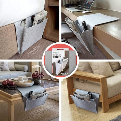 This bedside caddy hooks over bed edges to keep books, electronics, remote controls, a snack or two, and more at your fingertips. It comes in a two-pack, so maybe one for each side? While you can slip the flap of this bedside caddy between your mattress, it also comes with an adhesive so you can use it with desks or coffee tables, too.