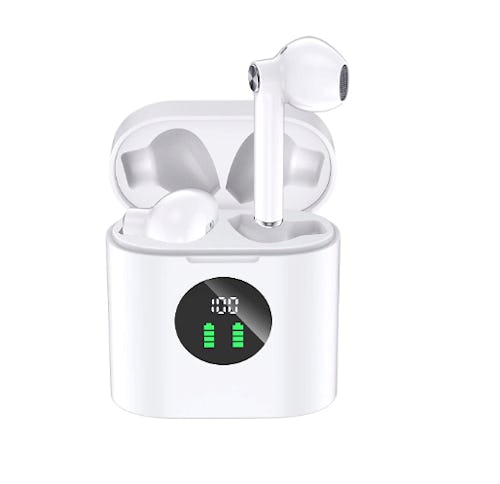 These wireless earbuds look a lot like Apple AirPods, but they're way more wallet-friendly. They're compatible with most bluetooth devices, and can play for 30 hours before they need to be recharged in their case. On top of that, they're also sweat-proof, so you can wear them while you work out, and the LCD screen displays how much power both the earbuds and the case have before they need to be recharged.