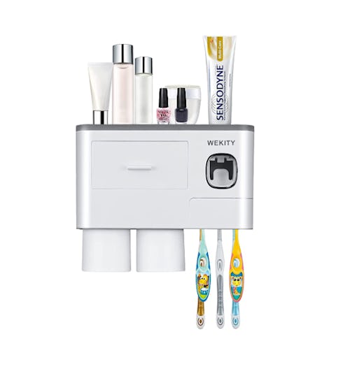 This wall-mounted toothbrush holder makes it super easy to keep your bathroom counter neat and tidy. It features a special toothpaste holder so that you can place your toothbrush into the slot, and it'll squeeze out the perfect amount of toothpaste. It also features space to hold up to four toothbrushes and two sets of paper cups, along with a small drawer to store items like floss and toothpicks.
