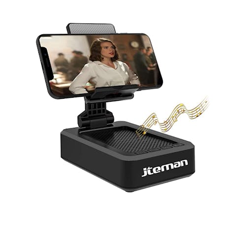 This cell phone stand that has its own Bluetooth speaker