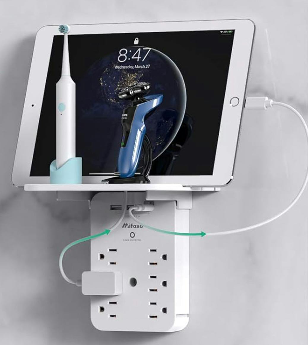 Place smart devices or Bluetooth speakers on the removable shelf that conveniently comes with this wall outlet extender. The shelf features a small cutout to thread cables through that are plugged into one of the six available AC units, two USB-A ports, or one USB-C port. Plug it into any standard outlet while a built-in surge protector keeps all your devices and circuits safe.