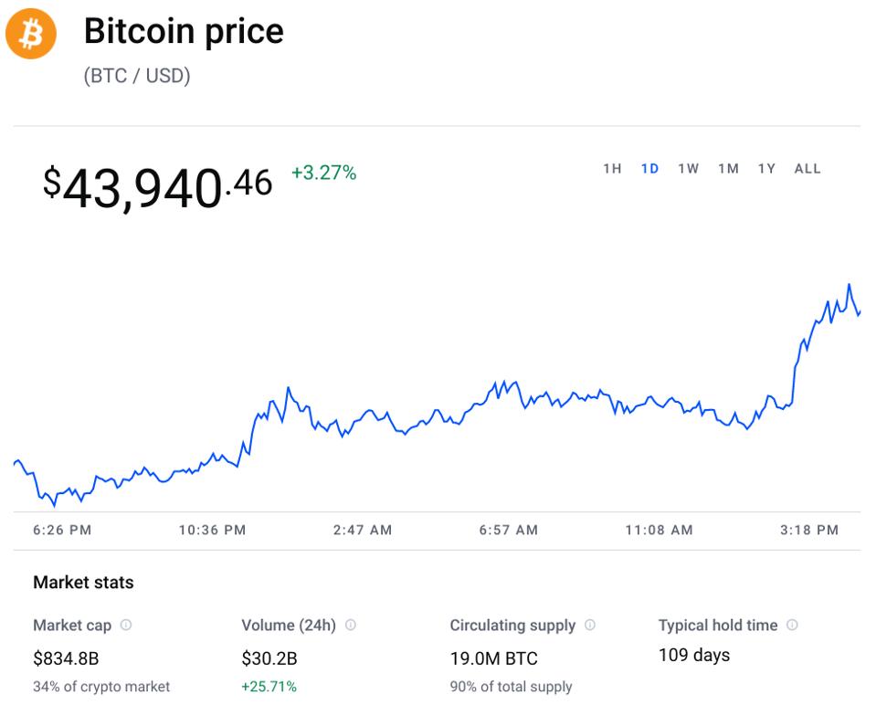 The bitcoin price surged to over $45,000 per bitcoin before falling back slightly and has now added around $10,000 to its price since dropping to lows of around $35,000 last month. Ethereum, the second-largest cryptocurrency after bitcoin, has also rallied as traders eye a looming upgrade that many think could turbocharge its price while cardano, an ethereum rival, has surged 40% over the last week.
