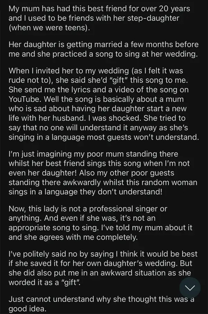 #25 Mum’s Friend Wants To Sing At My Wedding