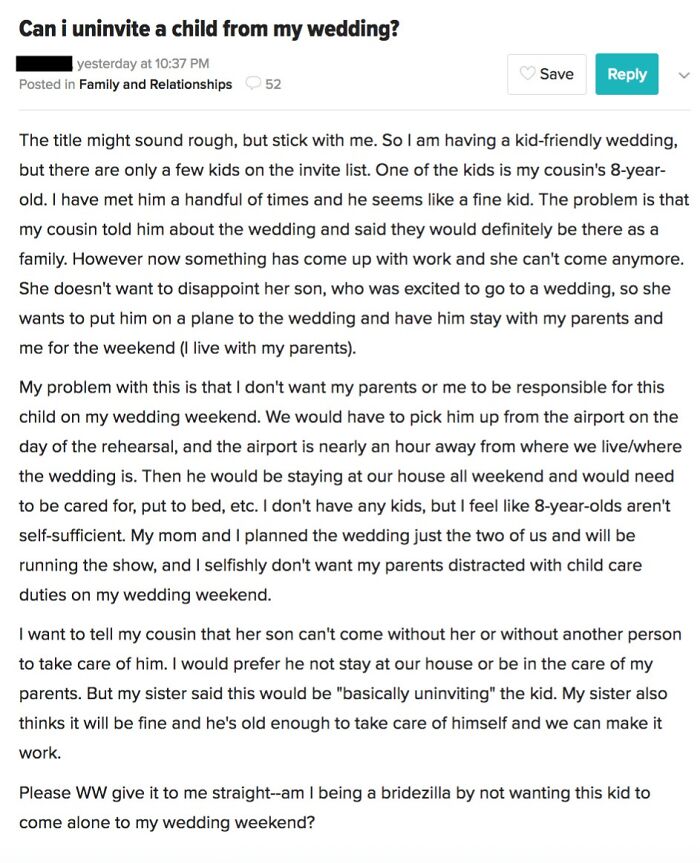 #36 Crazy Cousin Tries To Dump Her 8-Year Old Son On The Bride For Her Wedding Weekend