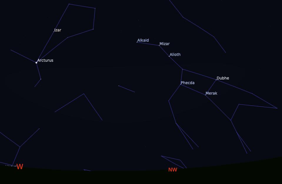 Find the Big Dipper in the northern sky. Its handle will be facing down towards the horizon. Follow that handle in an arc and you’ll come to Arcturus low in the eastern night sky. Arcturus is a very bright red giant star about 37 light years away. Now take a spike to the southeast, and you’ll see Spica just above the horizon. Spica is 261 light years away. You’ve just gone “arc to Arcturus, spike to Spica,” an important navigational “star-hop” only possible in spring.