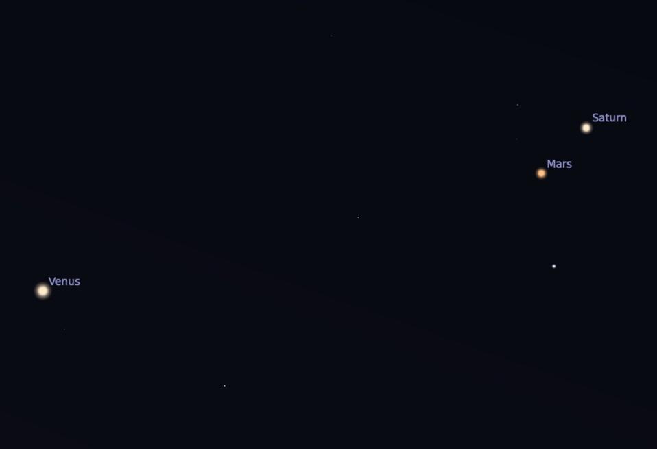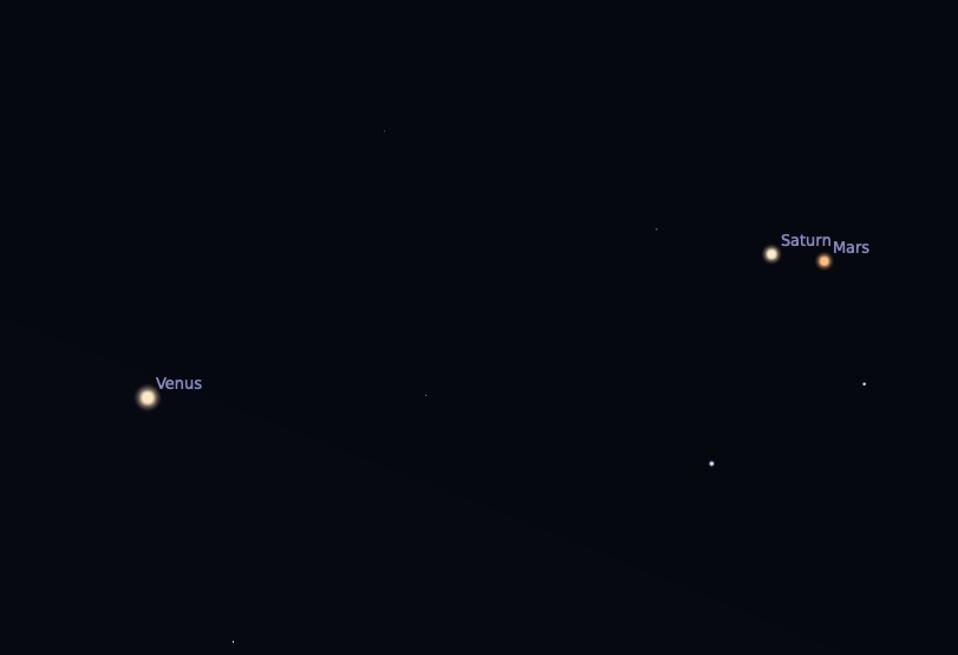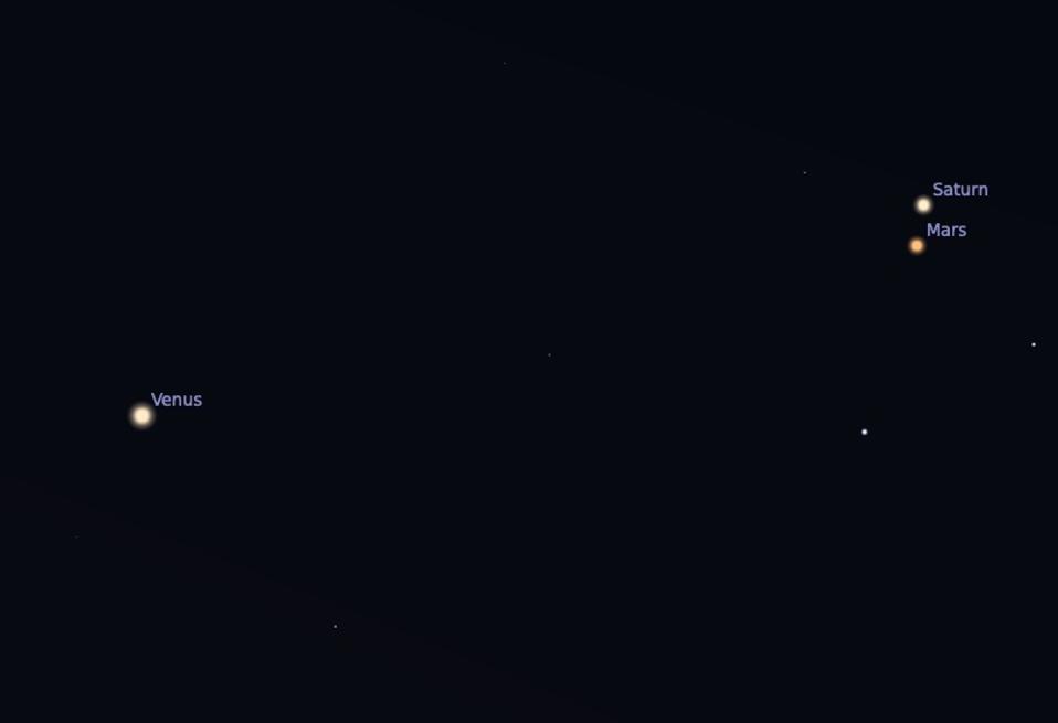Look to the southeast sky this morning and will see Saturn and Mars right next to each other, separated by less than one degree, which is roughly the width of the full moon. Just over to the left, you'll find the much brighter planet Venus.