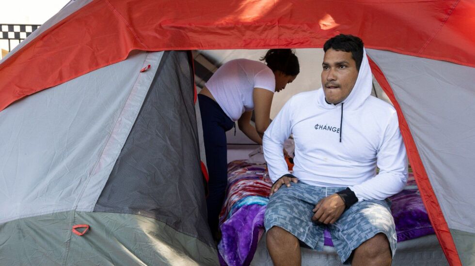 In his tent, Rossi can keep his immigration documents and belongings close by. But being out in the elements also can leave him exposed. An orange traffic post rigged with a piece of string keeps a plastic tarp in place over the tent to offer some protection from the rain. But water still leaks in.