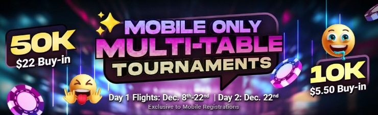 Players can enjoy two weeks of Multi-Flight Mobile-Only MTTs, with two buy-in levels to choose from, including a $22 buy-in with $50K GTD and a $5.50 buy-in with $10K GTD.