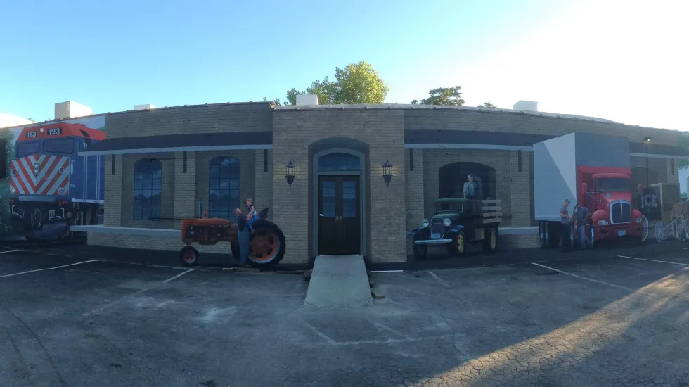 You aren’t in danger. It’s a 3-D mural painted on an outside wall of the tire store that features a train, a tractor, an old-fashioned pickup truck, an 18-wheeler and a horse-drawn ice wagon, with a plane overhead in the distance.