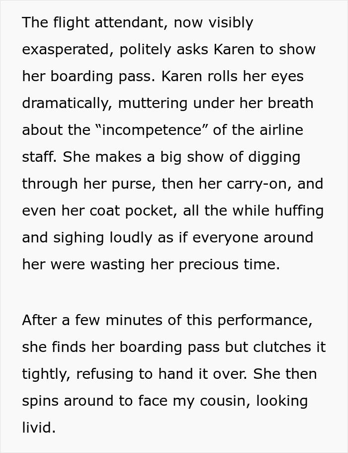 The plan could’ve easily backfired if the Karen just had some critical thinking skills—she would’ve known that there was no business class on the plane. But the cousin didn’t have the time to consider that.