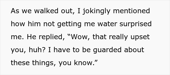 The OP tried to bring up the issue with their date later on because it was still a topic of contention between them. The man then explained that he felt getting water for someone was subservient and that he would only do it if the other person had earned it. The way of viewing this simple gesture was very different for both people.