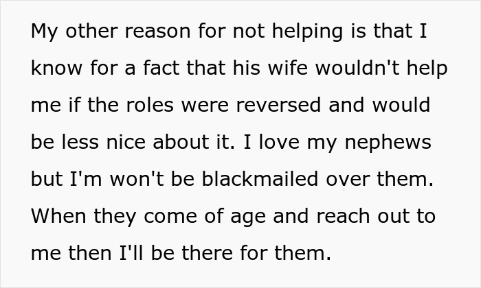 Years later, life decided it was time for yet another test. Chris, one of the OP’s brothers, fell seriously ill and became bedridden, leaving Alice to handle 4 kids and a pile of bills. Another sibling reached out, begging the OP to step in and save the day. His response? A polite but firm “no.” Our OP wasn’t about to reopen Pandora’s wallet.