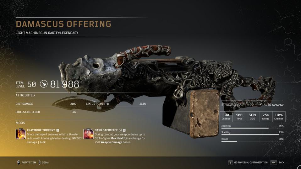 Weapon: Damascus Offering – This is the one I used. An LMG with 100 rounds and the newly buffed Claymore Torrent. Second mod switches to Dark Sacrifice for max damage. Your other two weapons are purely for style points as you will never use them.
