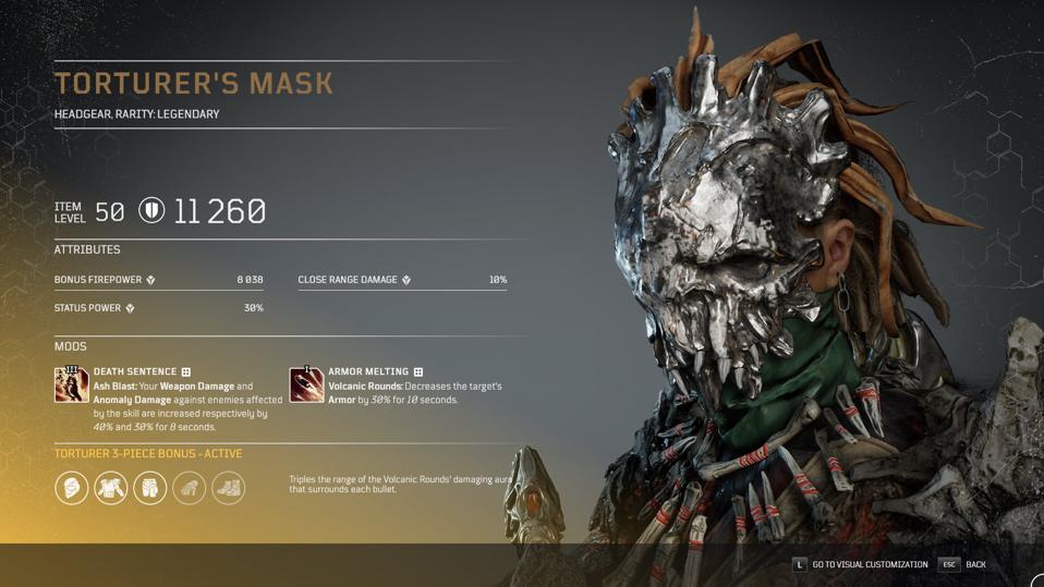 Armor Set: Torturer’s Head, Chest and Pants. All firepower, triples the size of your Volcanic Rounds AoE, but frankly I don’t notice it a ton. You mostly want these for the mods. I also use Gauntlets of the Cannonball as those are firepower and come with Tier 3 mod Captain Hunter built in. Look for Close Range Damage and Cooldown Reduction, probably, as sub stats.