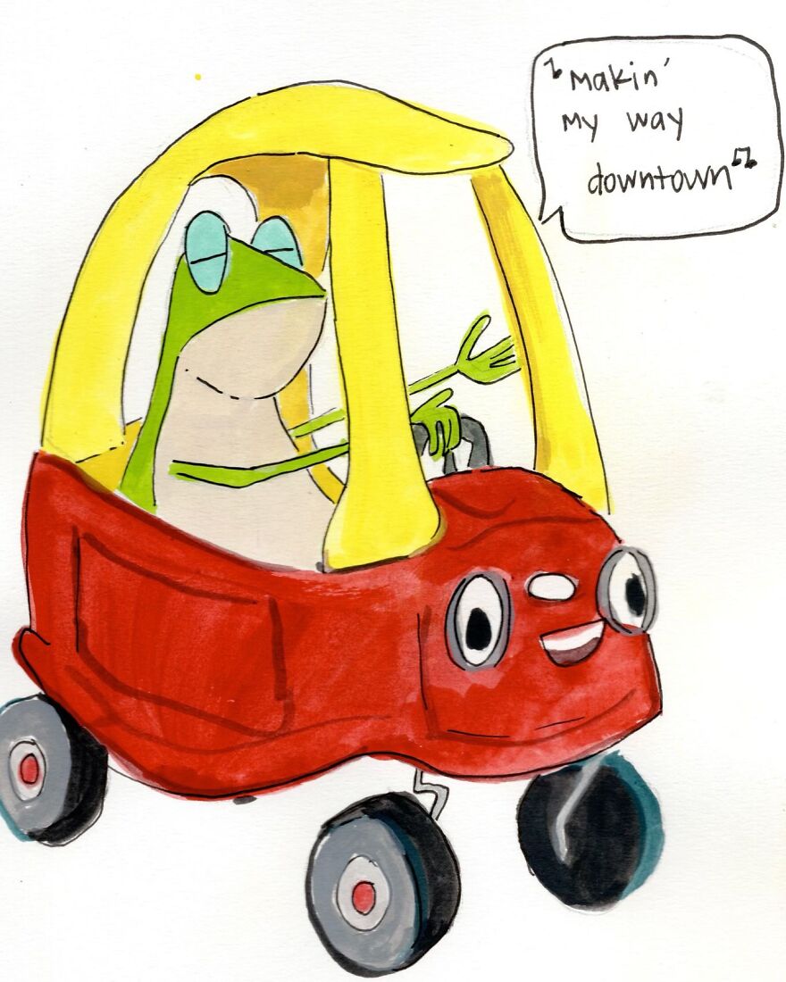 I usually just say I'm an artist and then try to leave it at that. If someone asks what kind of art I make I get real factual and say, ‘I watched a YouTube video once that said the best way to find my personal creativity was to draw one thing every day for a year so I just decided on a frog. I think the thought process is, that once I get bored enough with drawing that one thing I start to interject things that make it interesting to me to draw- whether it be the frog in different settings, little jokes, or stuff I've been thinking about with the frog to animate the point. So yeah. I draw frogs for a living’ which is a sentence I will never get used to saying.”