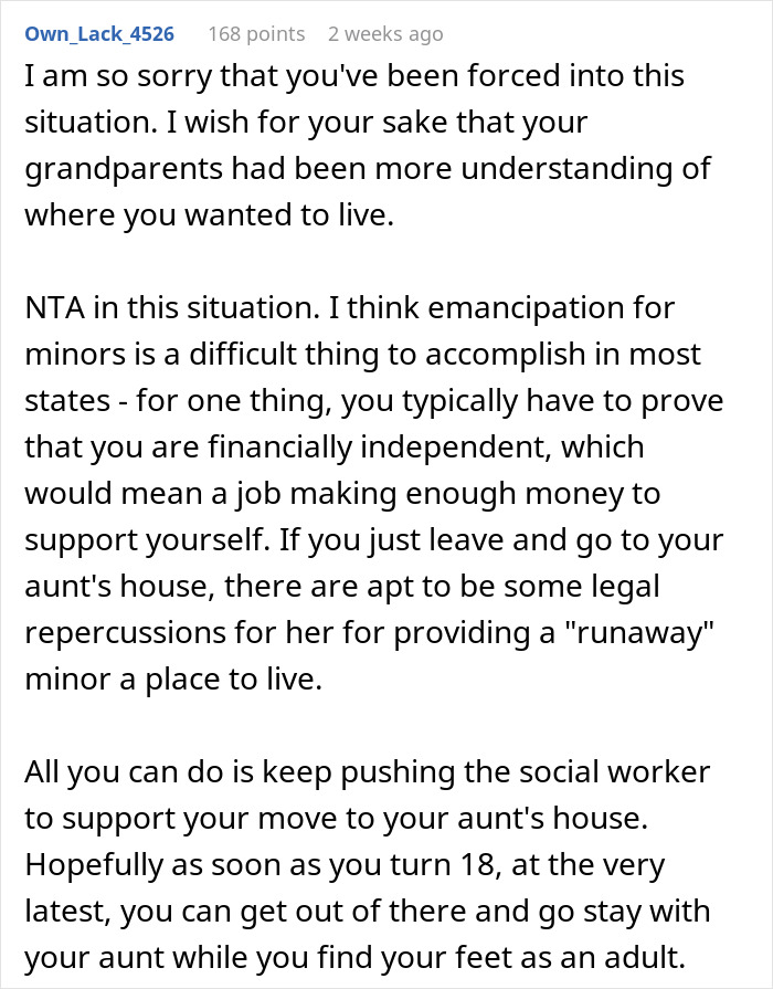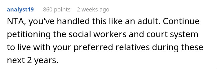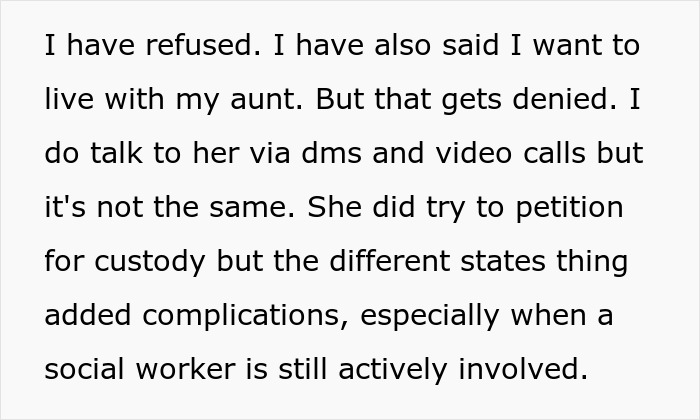 The OP’s family had also involved a social worker, so the teen was sent to live with his biological father rather than with an aunt he knew and who wanted to take him in. Despite the OP’s and his aunt’s pleas, the legal preference is for a biological parent over an extended family member. Which is what happened in the OP’s case and he was sent to live with his newfound dad and his wife and kids just 3 weeks after meeting the man.