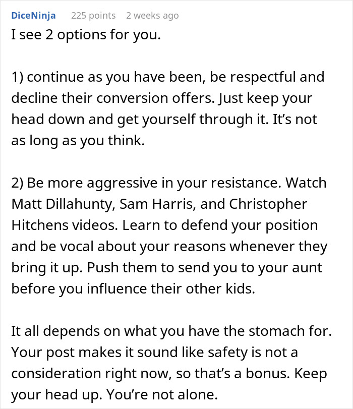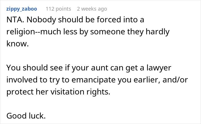 The situation hit a boiling point when the father’s wife insisted the OP should be grateful for the opportunity to be “saved” and accused him of being disrespectful and stubborn. The teen’s response was blunt: he declared they’re not his parents, but only people he was forced to live with, and that he will never participate in their religion. As expected, this declaration caused significant tensions, anger and friction in the household, with the dad and stepmom accusing the OP of being closed-minded.