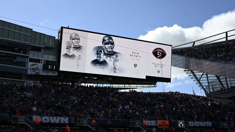 Dick Butkus’ image was ubiquitous in Soldier Field as the Bears celebrated his life and career throughout the game. Butkus died Oct. 5 at 80.