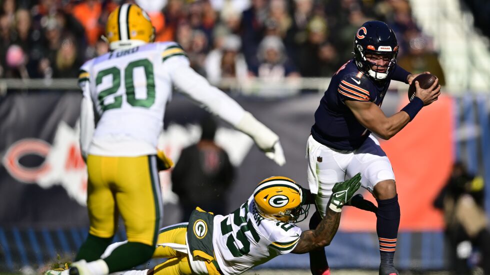 NFL Next Gen Stats has made measuring speed so ubiquitous that Fields was told Sunday, after he said he felt slow, that he reached 20.15 mph on a 55-yard touchdown run against the Packers. Fields responded wryly that he needed to reach 21 or 21.5 mph next time.