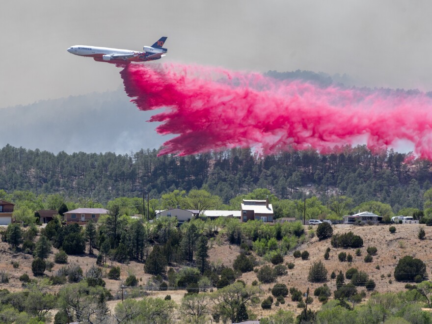 Fire bosses said they are seizing upon an interlude of relatively calm and cool weather to keep the fire from pushing any closer to the small New Mexico city of Las Vegas and other villages scattered along the fire's shifting fronts. Airplanes and helicopters dropped slurries of red fire retardant from the sky, as ground crews cleared timber and brush to starve the fire along crucial fronts.