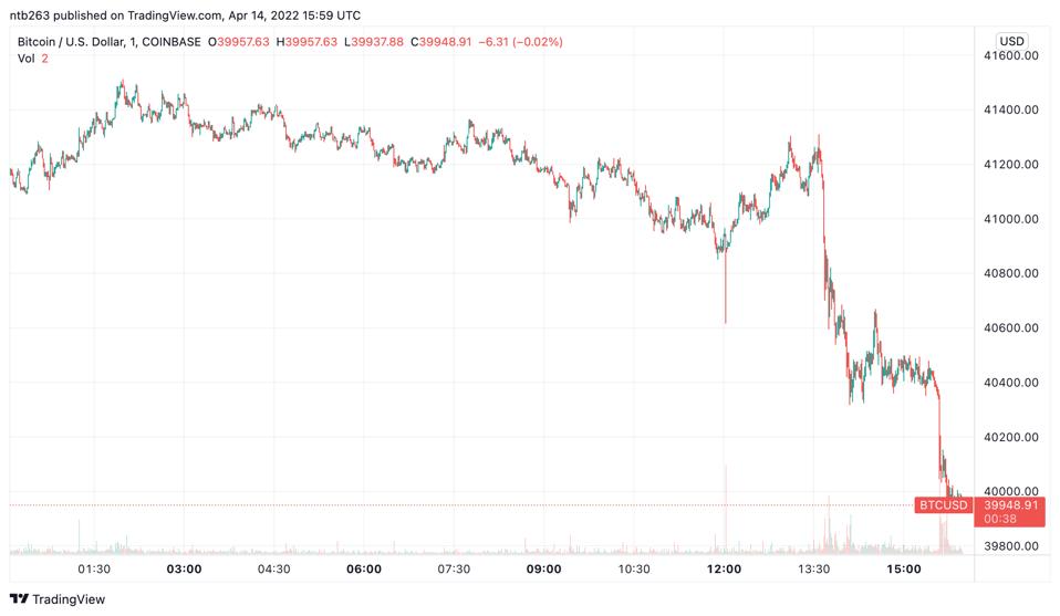 Bitcoin fell back below $40,000 Thursday morning, retracing yesterday’s gains, as S&P and Nasdaq slipped in the early trading hours.