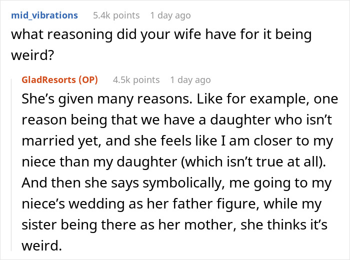 Yet, there were some who questioned why the wife was so frustrated with this arrangement when it sounded great from the outside perspective. To one commenter, he answered that his wife had given him her reasoning. She feels that he’s closer to his niece than his daughter, but he claims that it’s not true.