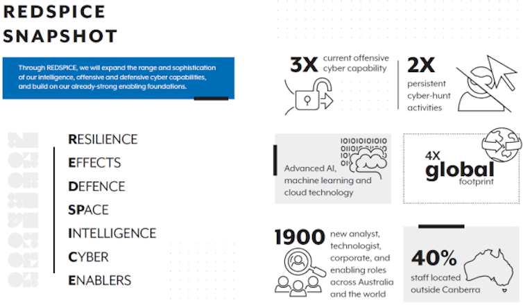 REDSPICE is a program to grow and enhance the intelligence and cyber capabilities of the Australian Signals Directorate (ASD) — the chief agency responsible for foreign signals intelligence, cyber warfare and information security.