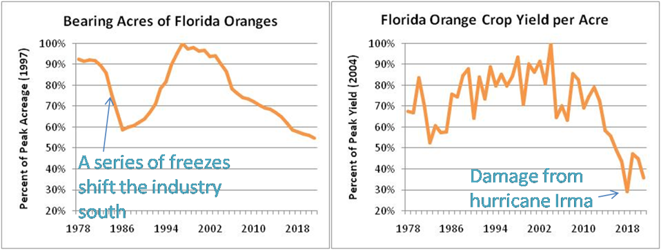 Particularly for the juice industry, critical mass is required for running processing plants. Therefore it has been necessary for the major brands to include imports from Mexico and Brazil. The one grower-cooperative juice brand that continued making a “100% Florida-grown” product for many years (Florida’s Natural) has no longer been able to maintain that distinction.