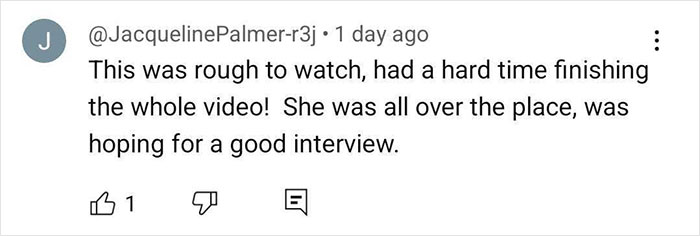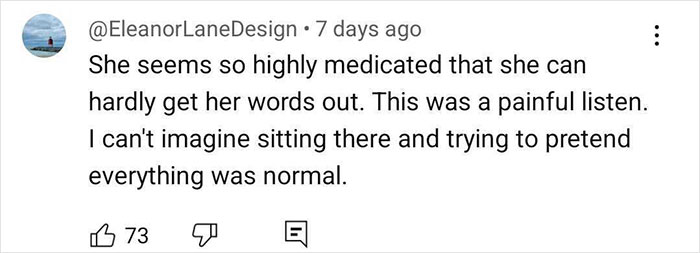 Another wrote, “She seems so highly medicated that she can hardly get her words out. This was a painful listen. I can’t imagine sitting there and trying to pretend everything was normal.”