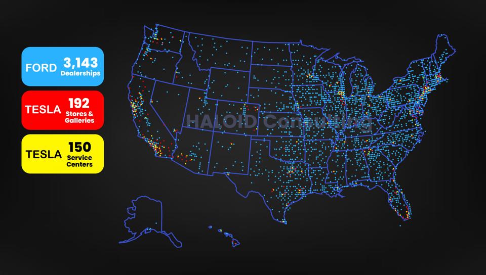 Caption: To replicate a sales and service network, in scale, would cost automakers billions; never mind the need to overcome retail learning curves that may take years. In Ford’s case, it has over 3,000 dealerships in the U.S. that sell and service Ford vehicles. TESLA’s 150 service and 200 sales locations are insignificant in comparison.