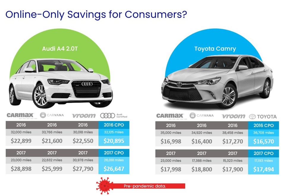 Caption: A review of used pricing between Carvana, Vroom, CarMax, and local franchise dealers shows no evidence of lower prices from the national brands. This example indicates that the local dealer sells a manufacturer certified vehicle for a comparable price with the added benefit of the manufacturer’s certified warranty. Pre-COVID-19 data was used as supply constraints are causing irrationality in the pricing of the current used car market. Data from the Atlanta market.