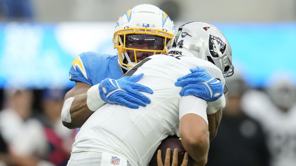 Mack had two strip-sacks of O’Connell, including one in the second quarter that resulted in Austin Johnson recovering the ball at the Raiders 35. That led to Justin Herbert’s 1-yard touchdown run, which extended the Chargers’ lead to 24-7.