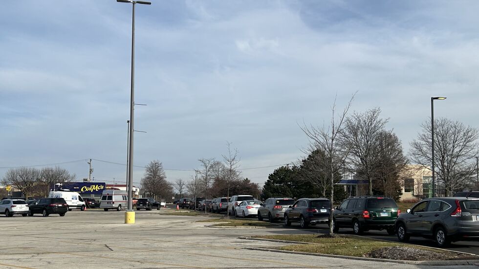 By noon, about 150 cars were waiting in a line that stretched south from the yellow-and-blue restaurant at 285 N. Weber Road and wrapped west around the shopping plaza to the opposite end.